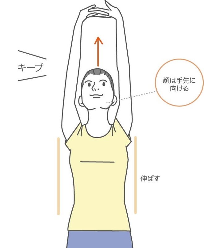 - 両手を頭の上で組んで、ぐーっと背筋を伸ばしながら深呼吸を3回