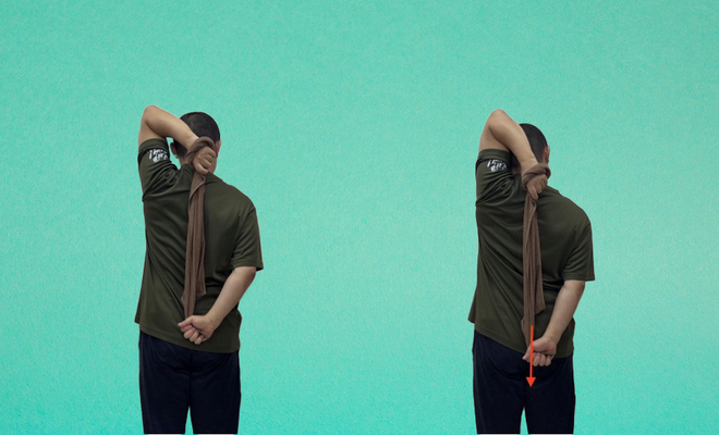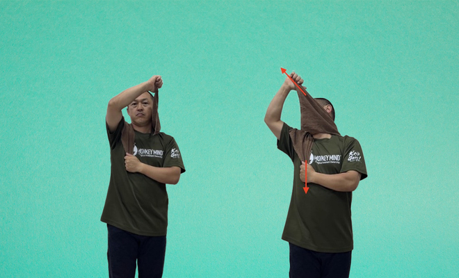 タオルの端を片手で握り(できればグルッと一周巻いておくとすっぽ抜けない)、頭の後ろに回してタオルを背中にたらします。反対の手でタオルの逆側の端を握り、ゆっくりと下に引いていきましょう。