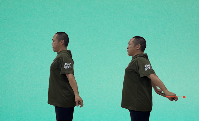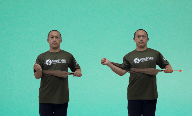 握ったタオルをゆっくりと外に引くようにする(画像では左手)ことで、腕がひねられていって(画像では右腕)ストレッチされます。