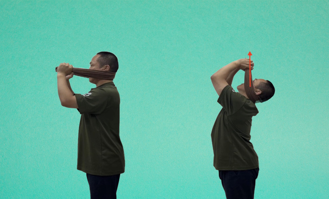 肘を閉じて手で少し牽引するようにしながらゆっくりと上に引っ張ってください。その動きに合わせて顔も天井を向くようにすると、首は自然なカーブを描くことができ、首の前側をしっかり伸ばすことができます。