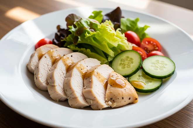 野菜中心の食事に、鶏むね肉や卵、豆腐、ツナ缶などを少量加えるだけで、食後の満足度は大きく変わります。