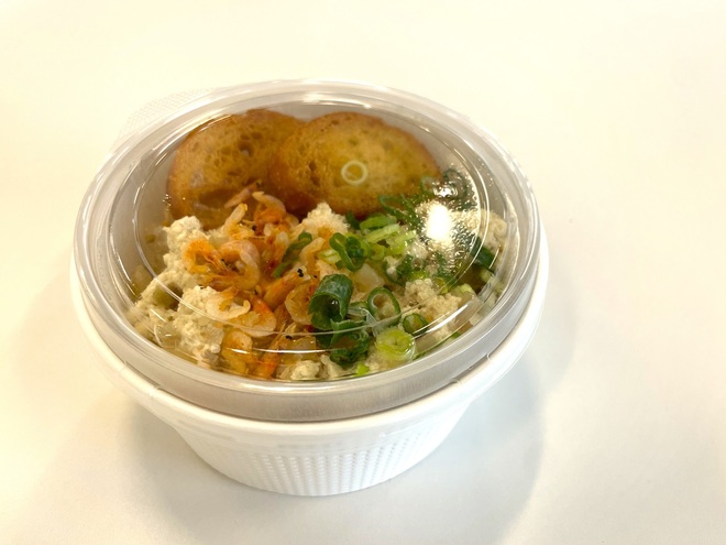 台湾の定番朝食料理「鹹豆漿(シェントウジャン)」を成城石井らしくアレンジしたのが「成城石井自家製 桜海老の台湾風豆乳粥」(539円)。スパイスや辛い味をイメージしがちな台湾グルメとは真逆の味わいで、ベースとなるガラスープと、豆乳スープをそれぞれ作り、白米の上に重ねています。