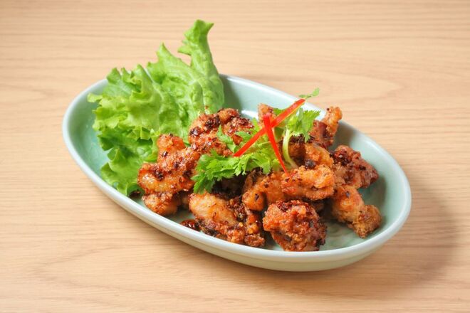 香ばしく炒めたにんにくと黒コショウの力強い風味に、麻辣の刺激を効かせた「麻辣ガイガティアム(税込1,680円」。タイの定番炒め料理に、しびれるアクセントを加えた食べ応えのある一皿。